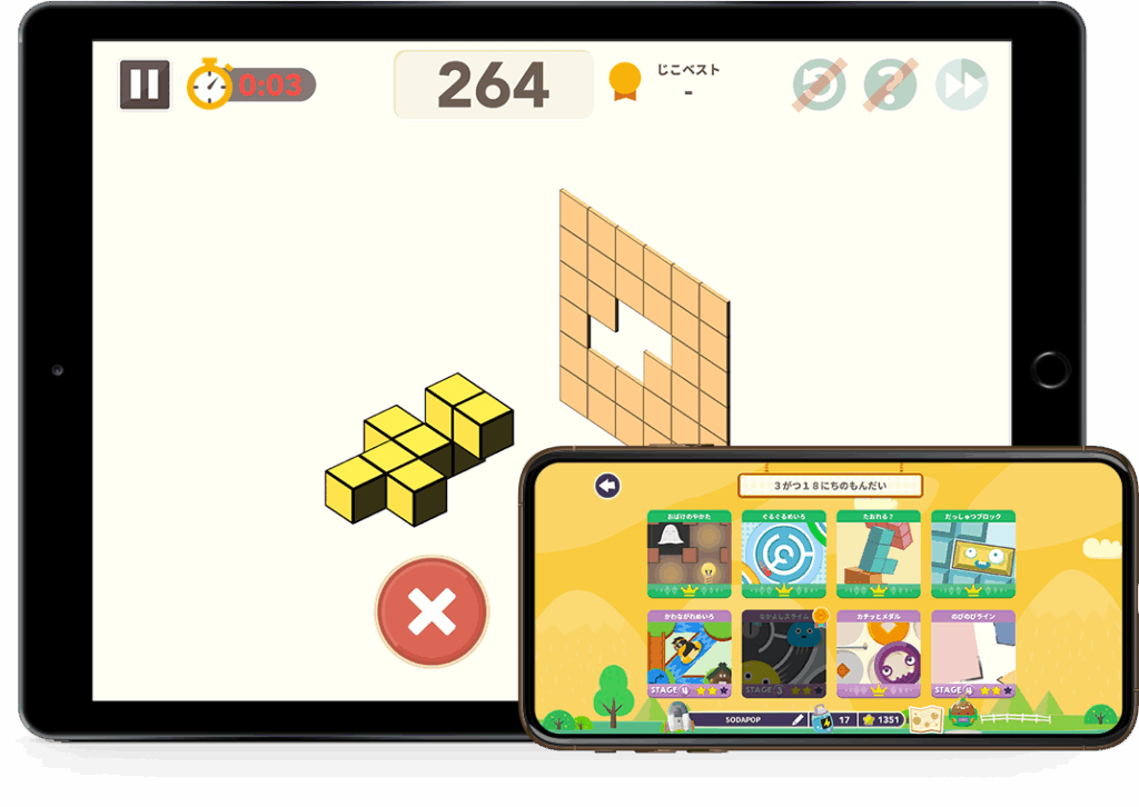 空間認識、平面認識、試行錯誤力、論理的思考、数的処理などをゲーム感覚のパズルで身に着けることができます。