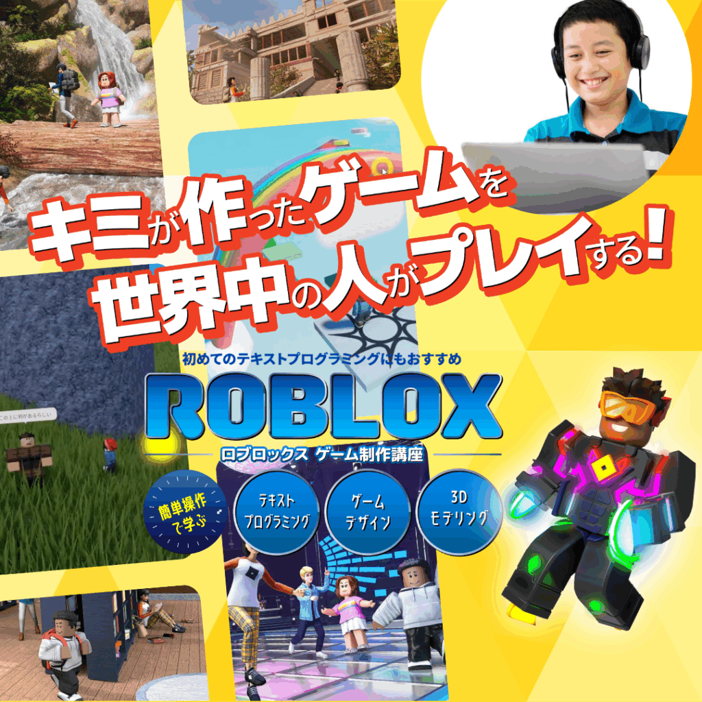 Roblox Studioコース Robloxはいま世界中の人々に人気の、ゲームを作成、共有、プレイできるオンラインゲーミングプラットフォームです。オリジナルの3D空間でゲームを作成し、プレイすることができます。Roblox Studioコースでは、このRobloxの世界を「つくる」ツールであるRoblox Studioの使い方から学び、迷路ゲームやアスレチックゲームを作成していきます。 Roblox Studioコースには「Roblox入門」「Roblox初級」と「ゲームクリエイター」の3段階があります。 Roblox入門 Roblox Studioの使い方 迷路ゲーム(1)(2) 柱渡りゲーム(1)(2)(3) 陸地や海をつくる(1)(2)(3) ツルツルすべる氷の世界(1)(2)(3) Robloxでプログラミング スクリプトってなに? 地獄の橋を渡れ!(1)(2)(3)(4)(5) タッチして色を変えろ(1)(2)(3) モグラたたきを作ろう!(1)(2)(3) Roblox初級 RobloxStudioの使い方 家具を作ろう!(1)(2)(3) メリーゴーランドを作ろう(1)(2)(3) アクセサリーを作ろう(1)(2)(3) アイテムを作ろう(1)(2)(3) ゲームクリエイター 基本操作 パーツの基本操作 アスレチックづくりとスクリプト パーツの位置・回転・サイズのプログラム パーツにふれたときのイベント処理 見た目と音でゲームを仕上げる コイン集め コインで買い物 コインの複製とランダム配置 NPCと会話 GUIによる演出 ゲームの仕上げ 料金はこちら