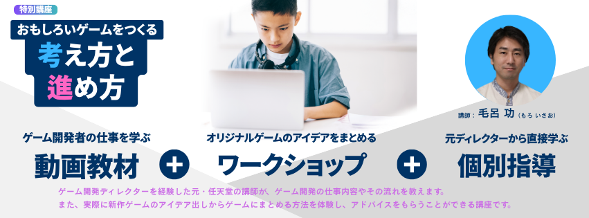 特別講座2026 「おもしろいゲームの考え方と進め方」 昨年度、約130名が受講し、好評を博したゲーム開発特別講座を、今年も開講いたします。 昨年度のアーカイブ動画を活用することで、より参加者のペースで受講することができるようになりました。 講座内容 ゲーム開発の仕事を知る動画教材 「ゲームクリエイターの仕事、とは?」 「企画立案から完成までの流れ」 「おもしろさ、とは?」 「アイデアの出し方」 オリジナルのゲームを開発するアイデアをまとめるワークショップ 企画したゲームのアイデアを参加者どうしで発表し、意見交換 個別指導 企画段階または開発段階のゲームを講師にみせて、アドバイスをもらえる個別相談(30分)つき 完成品を提出した方全員に講師からコメント 対象 小学4年生以上のプログラミング経験者(推奨) 参加費 11,000円(前回参加者割引、TFE/TH加盟教室団体割引あり) 開催場所 オンライン(Zoom) 定員 100名(先着順) 申し込み方法 個人参加:Googleフォームからお申込みください。(※申し込みにはGoogleアカウントが必要です)TFE/TH加盟教室団体参加:教室の先生にご確認ください よくある質問 FAQをご確認ください お問い合わせ アトリエゆうまでお問い合わせください